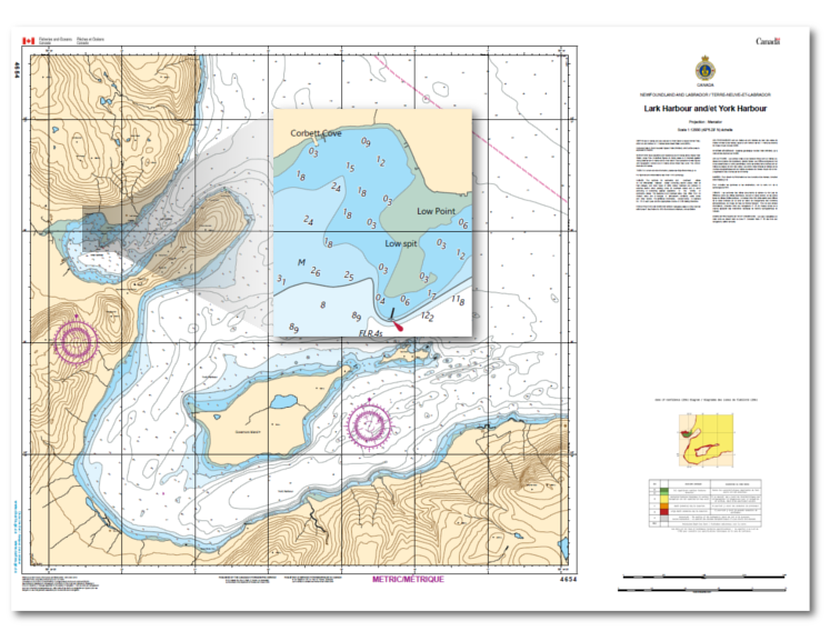 Nous lançons notre première carte de navigation papier automatisée, 4654 - Lark Harbour et York Harbour, Terre-Neuve-et-Labrador. Vous pouvez accéder à la nouvelle carte au moyen de votre dépositaire actuel de cartes. Trouvez un distributeur.