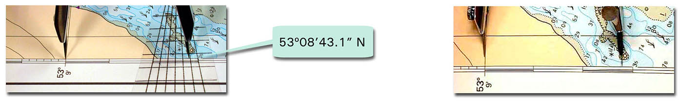 Relevez la coordonnée de latitude le long de l'orle à l'aide d'un compas à pointes sèches. Marquez cette distance sur la carte marine.