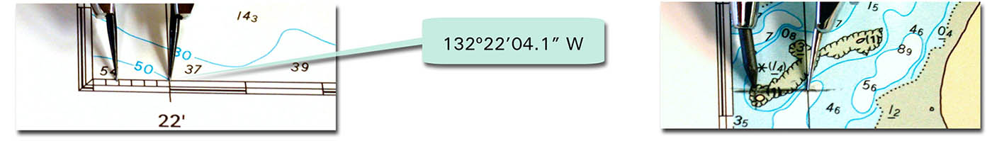 Relevez la coordonnée de longitude le long de l'orle à l'aide d'un compas à pointes sèches. Marquez cette distance sur la carte marine.