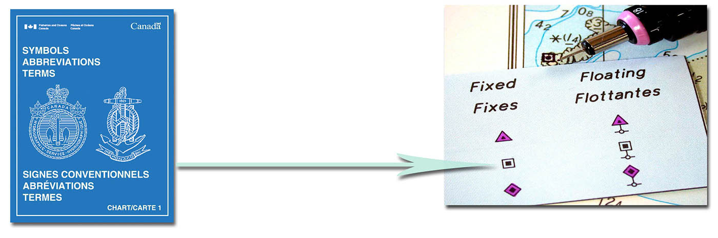 Utilisez la Carte 1 Signes conventionnels, abréviations et termes utilisés sur les cartes marines pour trouver le signe conventionnel qui se rapporte à la modification requise. Ajoutez le signe conventionnel à l'intersection de la latitude et de la longitude.